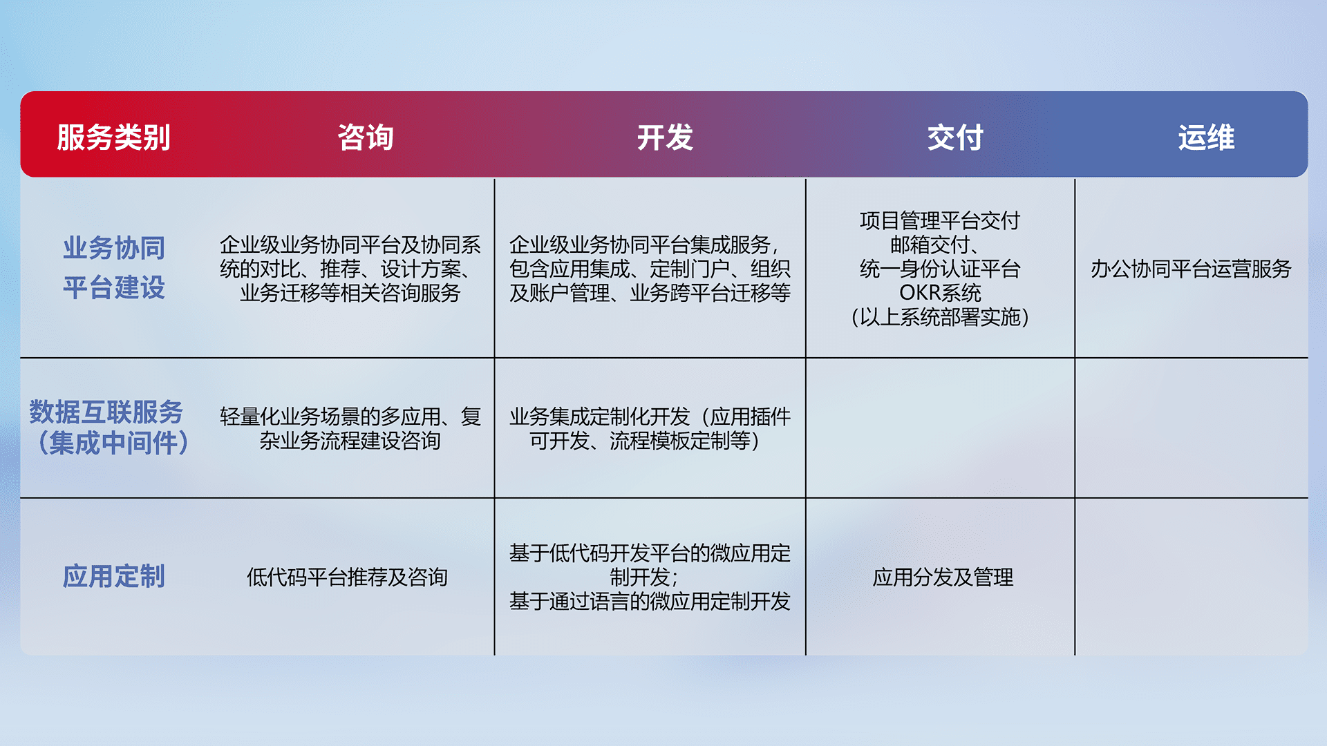 针对钉钉、、企微、、IDaas等平台级产品提供产品的规划、、、、方案、、交付、、、、定制化开发等服务,,,,实现如统一协同办公、、、、智能客户服务、、混合会议管理、、、智能数据查询、、、等业务场景,,,实现数字化转型。。。